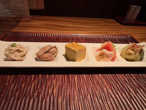 まずは「おまかせ 季節のおつまみ五点盛り合わせ」、ひとり呑み用の限定メニュー。品のある出汁が煮含まれた「冷なす 出汁おひたし」、1ヶ月熟成された自家製玉ねぎドレッシングがかかった「フルーツトマト」、しっとり食感と胡麻のコクたっぷりの「自家製塩麹の蒸し鶏 自家製胡麻野菜ソース添え」、蕎麦出汁たっぷり江戸前な味わいの「厚焼き玉子」、マデラ酒を入れて塩茹でされた「生落花生 塩茹で」は千葉・四街道のおおまさりだ。大野屋スペシャリテで"万能つまみ"の「里芋鶏味噌チーズ」は、クリームチーズのコクにいぶりがっこの燻製香、鶏味噌の旨味と、食べるほどに様々な味わいが広がっていく。日本酒にもワインにもテキーラにも合わせてみたくなるのだが、アラックにもピッタリだったのはさすが。