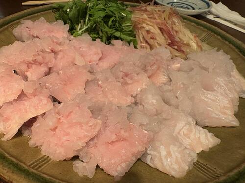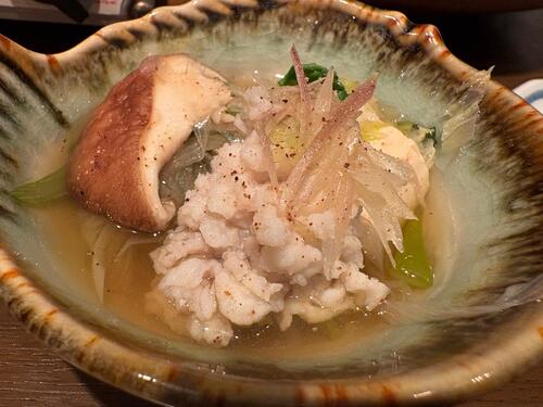 サラリーマン男性が一人来店。枝豆と瓶ビールを注文し、慎さんと談笑をされている。学生時代の友人のようだ。そこへ若いサラリーマンと女性も合流。鱧すきとテキーラのペアリングコースが始まる。