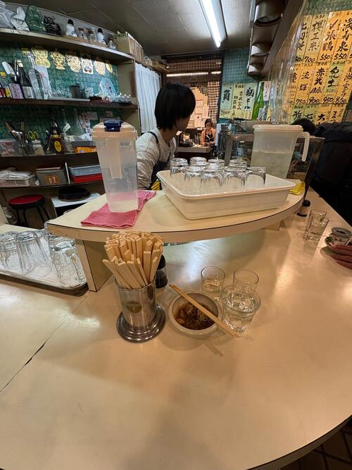 17時40分にいらした男性ひとり客は、牛すじとサッポロビール大瓶を1つ、後から合流されるお連れさんのためにコップを二つ受け取ってテーブル席で先に呑み始めている。